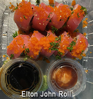 Lobster Tempura style, Avocado, Asparagus, Cucumbers, Cream Cheese and Masago inside-out, topped with Spicy Tuna & Krab