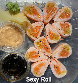 Salmon, Masago, Tempura Flakes and Spicy Mayo wrapped in Soy Paper